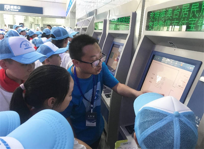 在雅安火車站行政辦公樓旁的操場上,運通公司工作人員就雅安火車站相關(guān)情況向孩子們進行了簡單介紹,對孩子們提出的問題進行了一一解答。下午4點13分,伴隨響亮的鳴笛聲,一輛動車駛出站臺,孩子們歡呼雀躍,興奮不已。在雅安火車站售票大廳,運通公司員工向孩子們講解了自助購、取票操作流程。