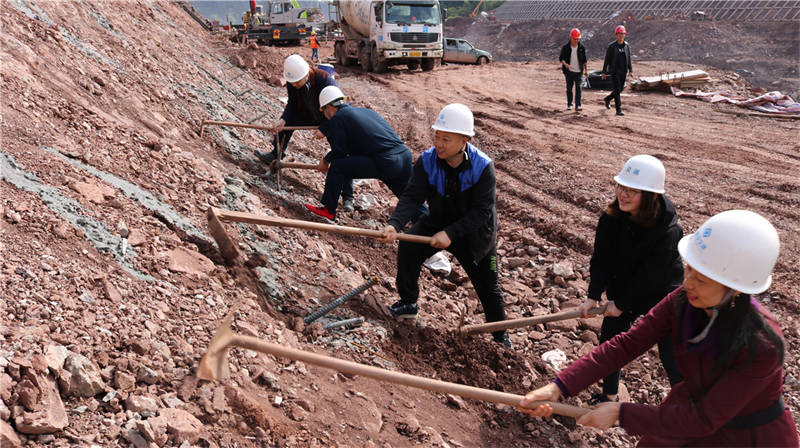 在活動現(xiàn)場,工程部部長劉太亮給大家介紹了雨名快速通道項目建設情況,高邊坡支護班組相關負責人現(xiàn)場指導高邊坡支護防護工作。全體黨員、入黨積極分子和公司其他員工在工程管理人員指導下,揮鎬舞鋤,積極參與勞動體驗。