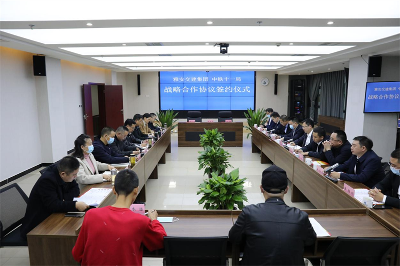 11月2日,雅安交建集團與中鐵十一局集團有限公司簽署戰(zhàn)略合作協(xié)議。集團黨委書記、董事長漆家華,中鐵十一局集團公司四川區(qū)域總經(jīng)理呂  涵參加并見證簽約儀式,集團黨委副書記、總經(jīng)理羅倫全與中鐵十一局集團四川區(qū)域副總經(jīng)理吳江偉代表雙方簽約。集團領導張萬清、張勝利、丁春、陸鷗、程學強,中鐵十一局四川區(qū)域副總經(jīng)理田景發(fā)以及四公司、五公司相關負責人見證簽約和座談交流。