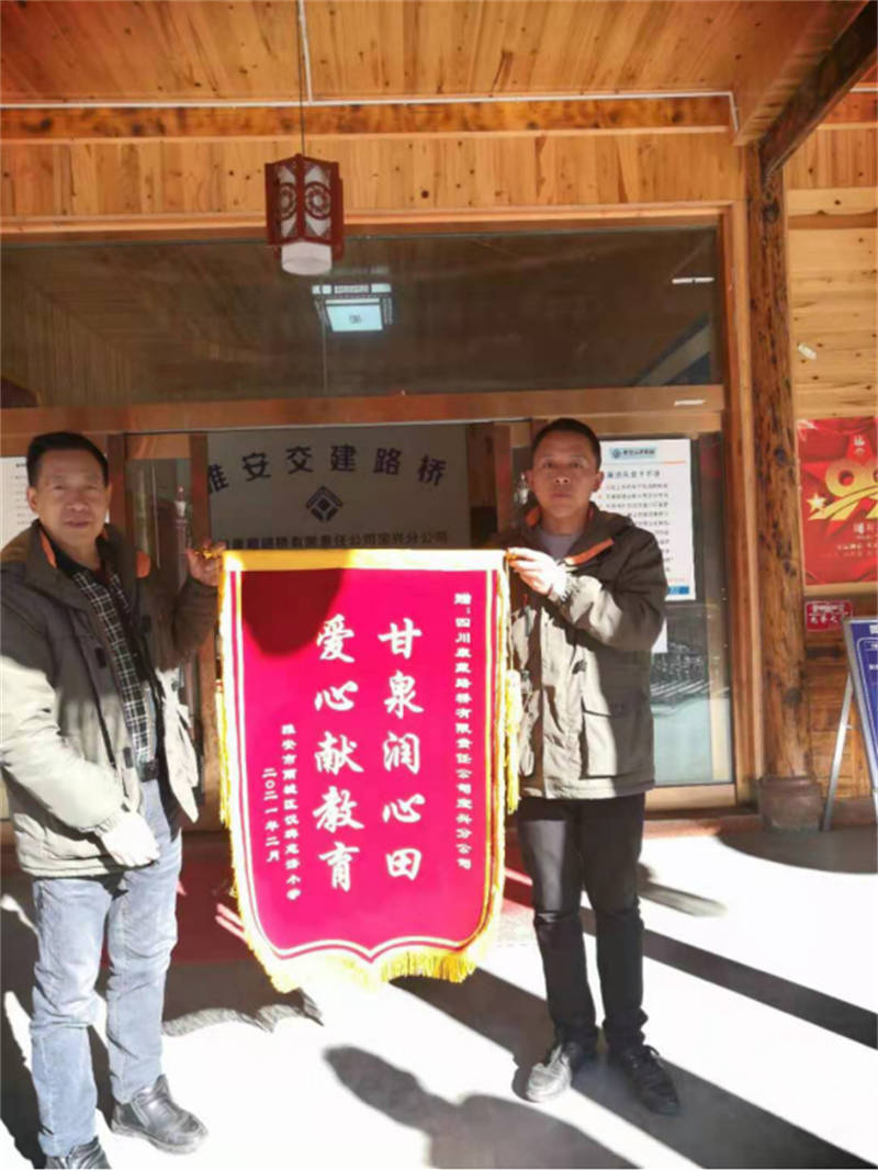 2月19日,雅安市雨城區(qū)第四小學(xué)漢碑校區(qū)將一面繡有“甘泉潤心田、愛心獻教育 ”的錦旗送到交建路橋公司寶興項目部,感謝路橋公司向漢碑校區(qū)捐贈5萬元基金用以建設(shè)該校勞動教育烹飪基地。