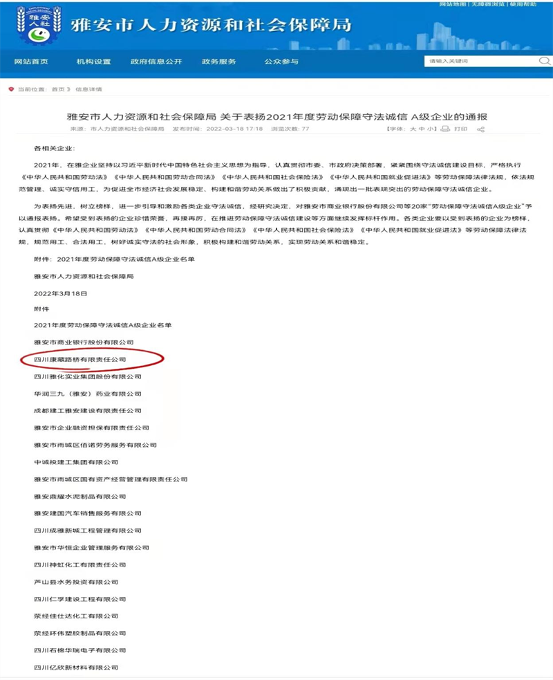 近日,根據(jù)《雅安市人力資源和社會保障局關(guān)于表揚2021年度勞動保障守法誠信 A級企業(yè)的通報》,雅安交通建設(shè)(集團(tuán))有限責(zé)任公司下屬四川康藏路橋有限責(zé)任公司榮獲2021年度勞動保障守法誠信 A級企業(yè),名列我市“誠信紅榜”。