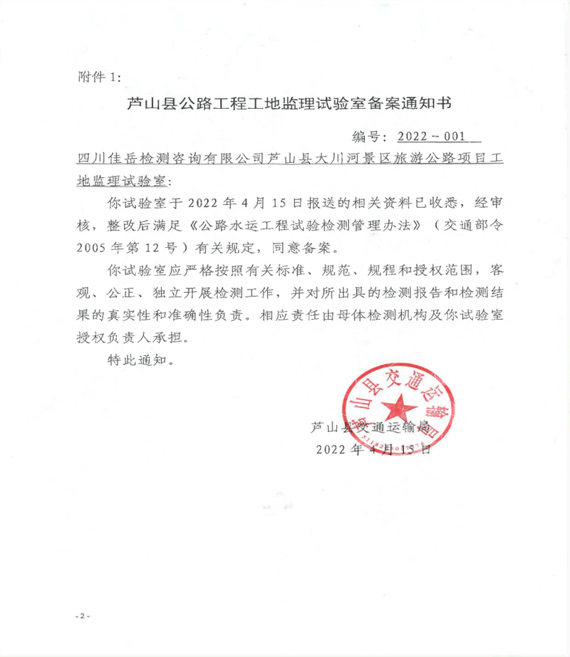 近日,交建集團(tuán)四川佳岳檢測(cè)咨詢有限公司蘆山縣大川河景區(qū)旅游公路項(xiàng)目監(jiān)理試驗(yàn)室,通過(guò)蘆山縣交通運(yùn)輸局備案驗(yàn)收,標(biāo)志著佳岳公司蘆山監(jiān)理試驗(yàn)室對(duì)蘆山縣大川河景區(qū)旅游公路項(xiàng)目可以獨(dú)立開(kāi)展母體授權(quán)參數(shù)內(nèi)的檢測(cè)工作,出具相應(yīng)的檢測(cè)報(bào)告。