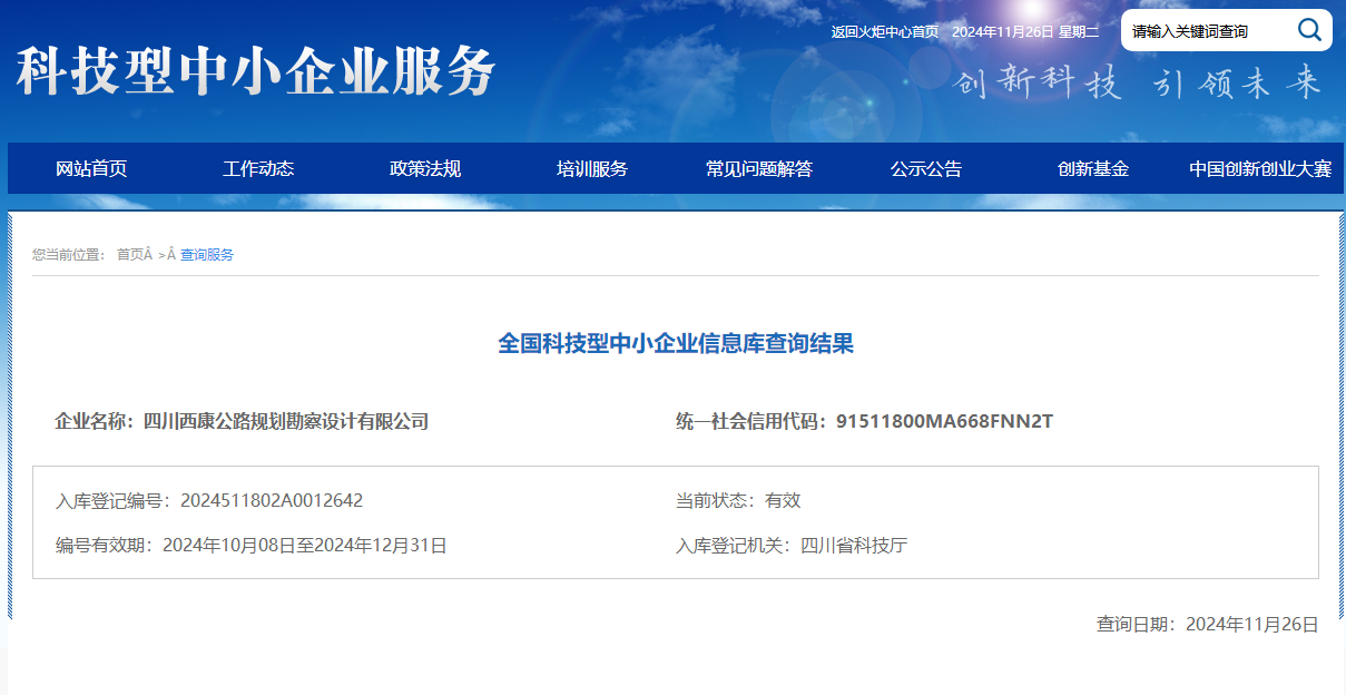 近日,四川省科學(xué)技術(shù)廳公布了本年度第五批入庫科技型中小企業(yè)名單,雅安交建集團四川西康公路規(guī)劃勘察設(shè)計有限公司榮獲“國家級科技型中小企業(yè)”稱號,標(biāo)志著公司在科技創(chuàng)新道路上邁向了新的高度。