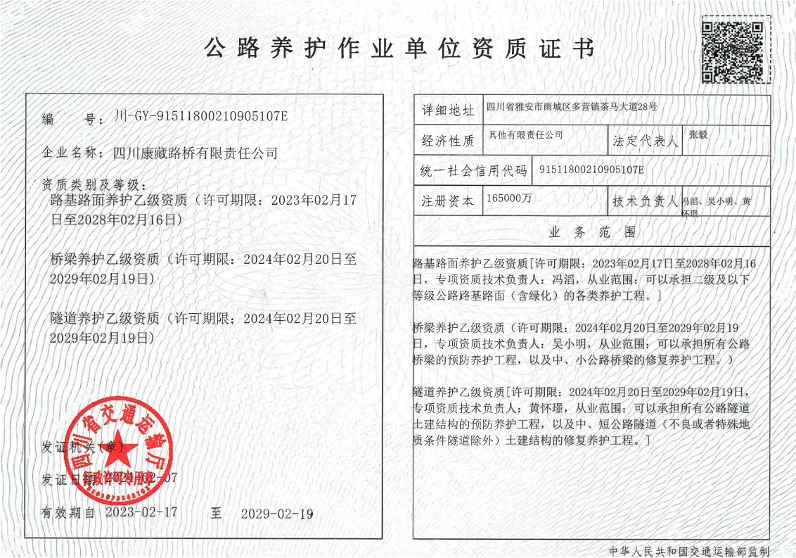 近日,雅安市交通建設(shè)(集團(tuán))有限責(zé)任公司通過自主申報(bào),成功通過四川省交通運(yùn)輸廳公路養(yǎng)護(hù)作業(yè)單位資質(zhì)評(píng)審,完成公路養(yǎng)護(hù)作業(yè)單位資質(zhì)增項(xiàng),新增橋梁養(yǎng)護(hù)乙級(jí)、隧道養(yǎng)護(hù)乙級(jí)兩項(xiàng)資質(zhì)。