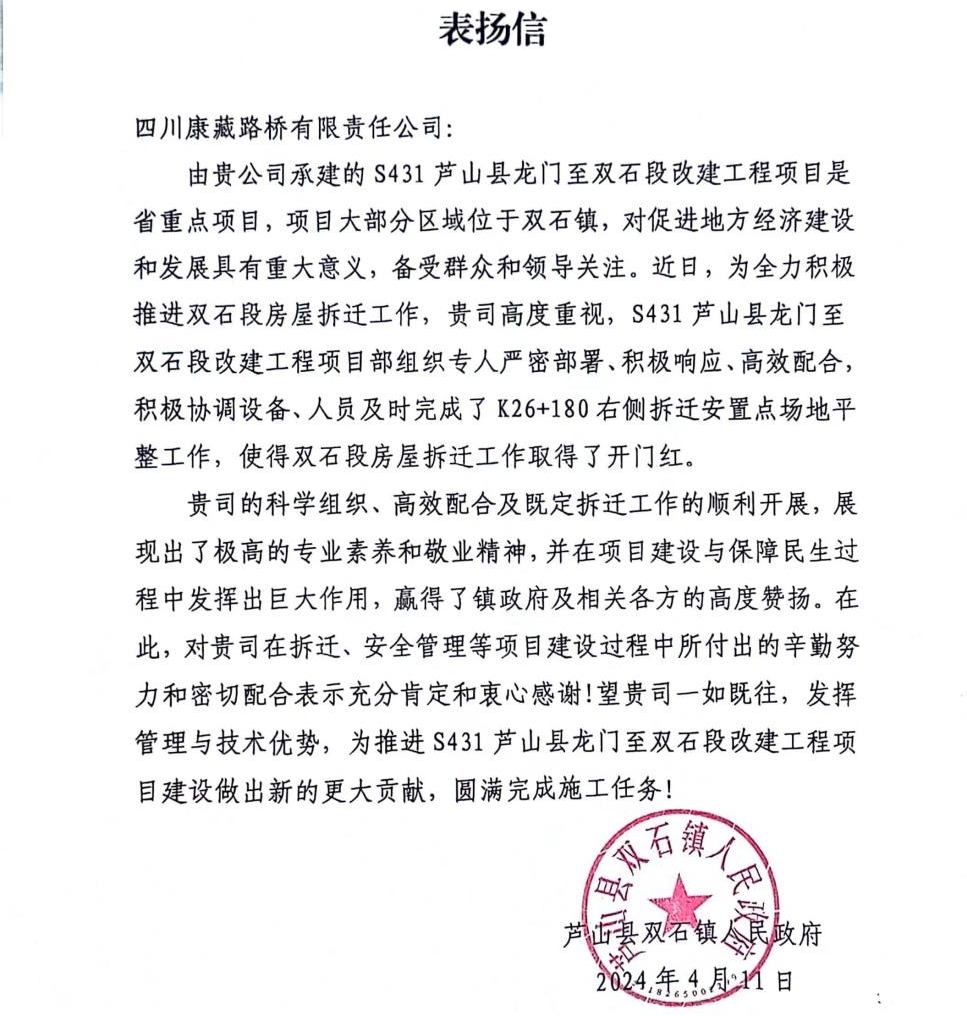 近日,雅安交建集團(tuán)四川康藏路橋有限責(zé)任公司收到來自蘆山縣雙石鎮(zhèn)人民政府的表揚(yáng)信。信中對S431蘆山縣龍門至雙石段改建工程項(xiàng)目部積極協(xié)調(diào)設(shè)備、人員配合當(dāng)?shù)卣瓿蒏26+180右側(cè)拆遷安置點(diǎn)場地平整工作,使得雙石段房屋拆遷工作取得了開門紅給予了高度評價和贊揚(yáng)。