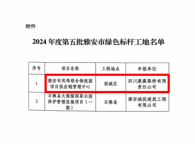 近日,由雅安交建集團康藏路橋公司建設的鳳鳴綜合物流園項目供應鏈管理中心,經(jīng)市住建局、市生態(tài)環(huán)境局、市城管執(zhí)法局聯(lián)合評審小組綜合考評,被評為雅安市綠色標桿工地。