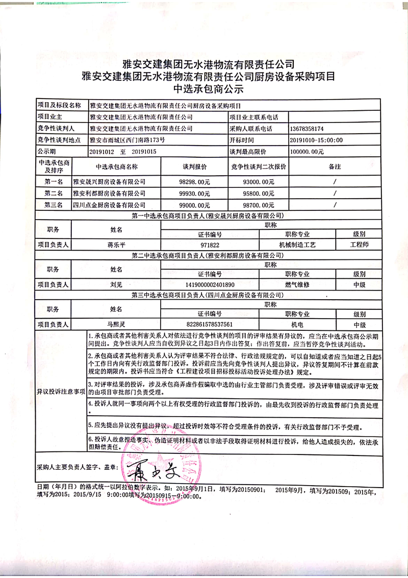 雅安交建集團無水港物流有限責任公司廚房設備采購項目中選承包商公示