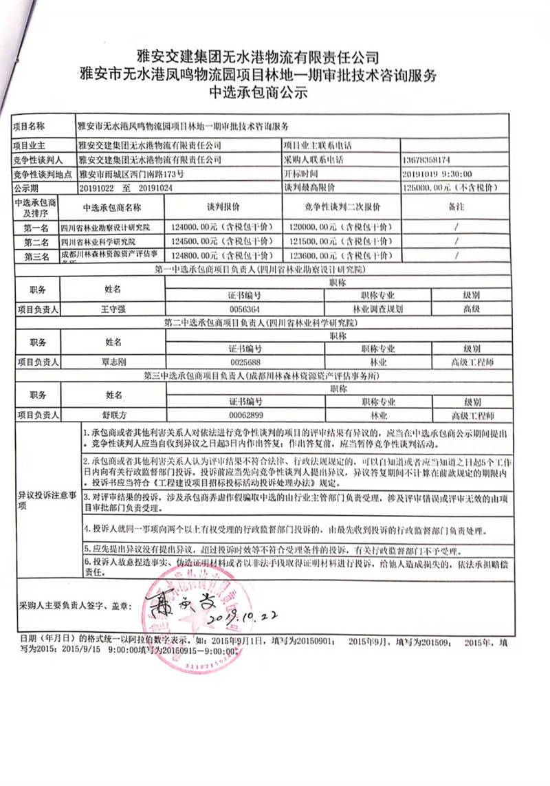 雅安交建集團無水港物流有限責任公司雅安市無水港鳳鳴物流園項目林地一期審批技術(shù)咨詢服務中選承包商公示