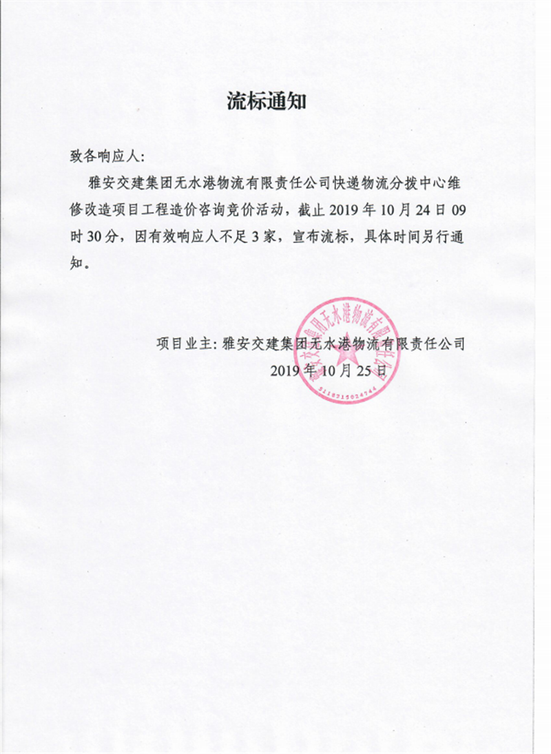 雅安交建集團(tuán)無水港物流有限責(zé)任公司快遞物流分撥中心維修改造項(xiàng)目工程造價(jià)咨詢競(jìng)價(jià)流標(biāo)通知