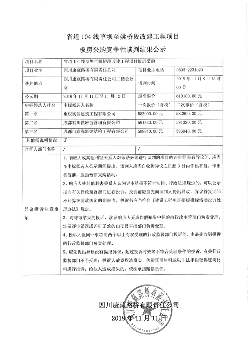 四川康藏路橋有限責(zé)任公司省道104線草壩至姚橋段改建工程項(xiàng)目板房采購(gòu)競(jìng)爭(zhēng)性談判結(jié)果公示
