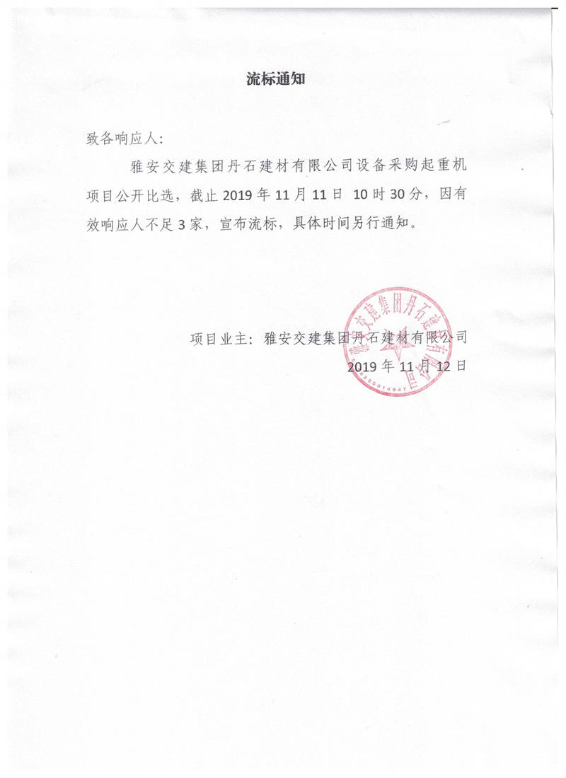 雅安交建集團丹石建材有限公司設備采購起重機項目流標通知