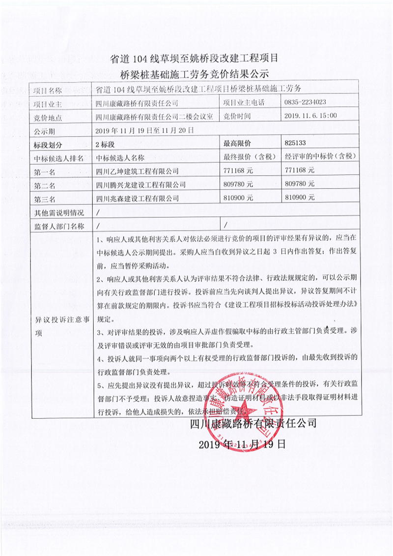四川康藏路橋有限責任公司省道104線草壩至姚橋段改建工程項目橋梁樁基礎施工勞務競價(2標段)結果公示