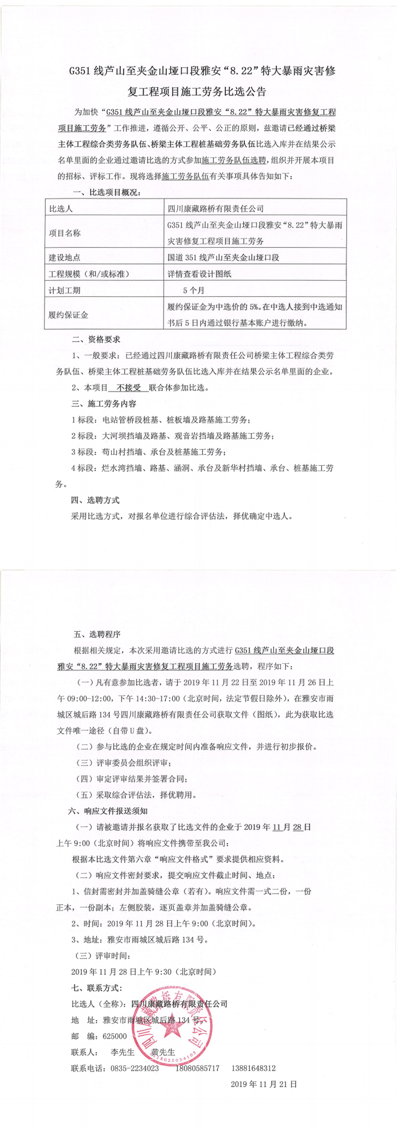 四川康藏路橋有限責任公司G351線蘆山至夾金山埡口段雅安“8.22”特大暴雨災害修復工程項目施工勞務比選公告