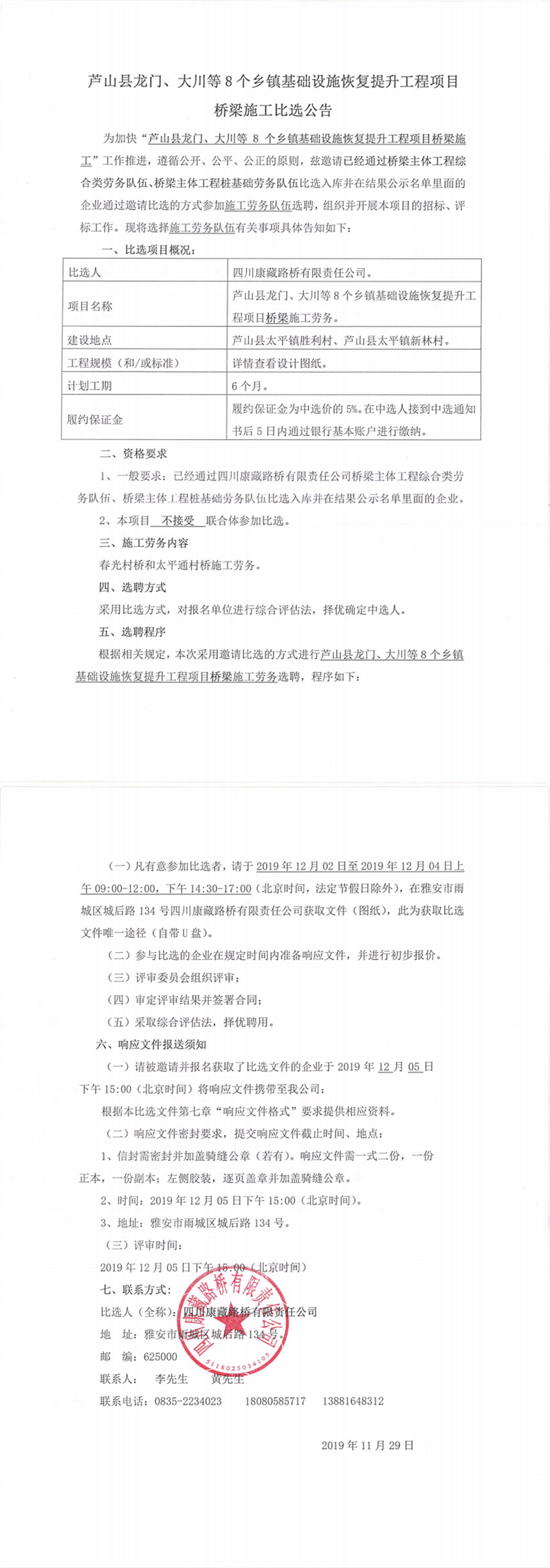 四川康藏路橋有限責(zé)任公司蘆山縣龍門、大川等8個鄉(xiāng)鎮(zhèn)基礎(chǔ)設(shè)施恢復(fù)提升工程項目施工勞務(wù)競價結(jié)果公示