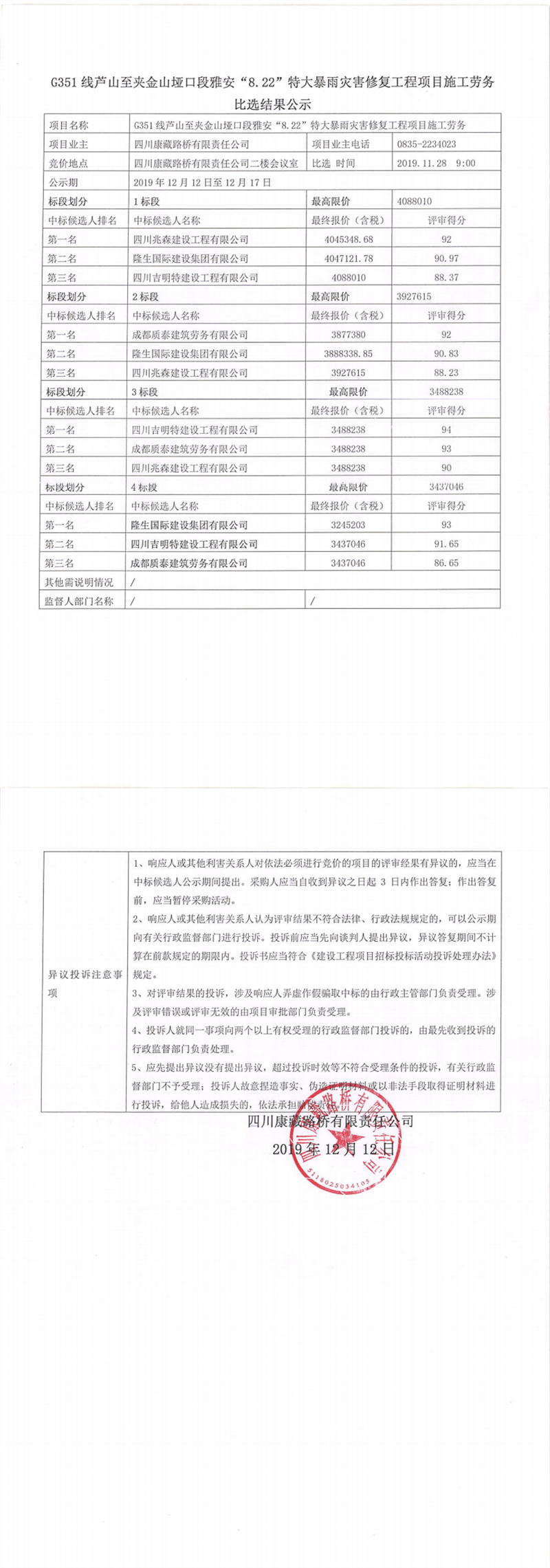 四川康藏路橋有限責任公司G351線蘆山至夾金山埡口段雅安“8.22”特大暴雨災(zāi)害修復(fù)工程項目施工勞務(wù)比選結(jié)果公示