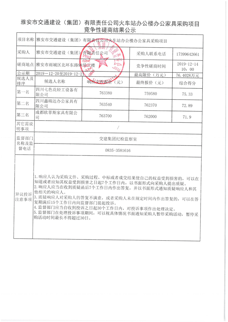 雅安市交通建設(shè)(集團(tuán))有限責(zé)任公司火車站辦公樓辦公家具采購(gòu)項(xiàng)目競(jìng)爭(zhēng)性磋商結(jié)果公示