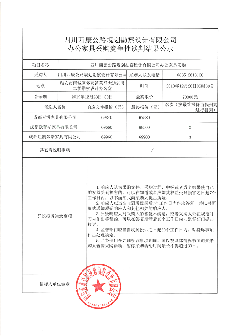 四川西康公路規(guī)劃勘察設(shè)計(jì)有限公司辦公家具采購競爭性談判結(jié)果公示