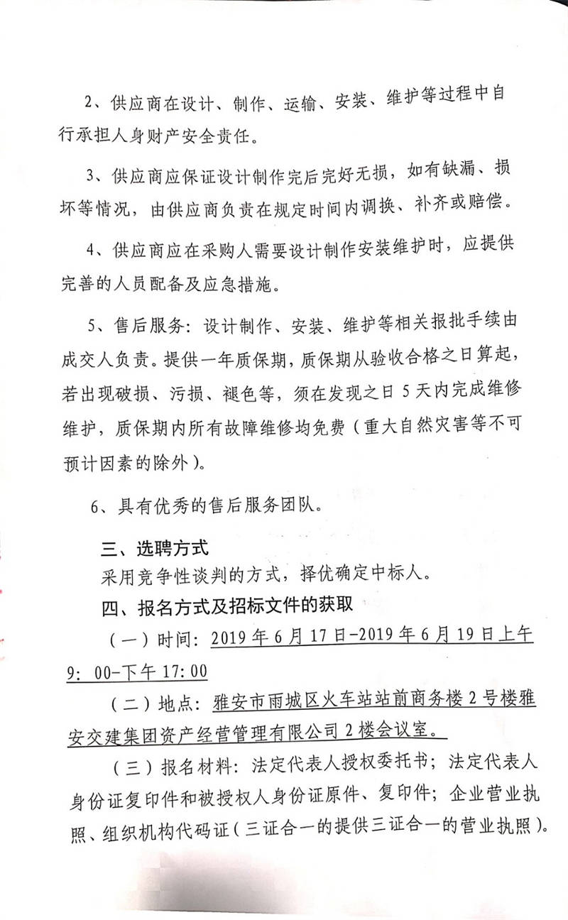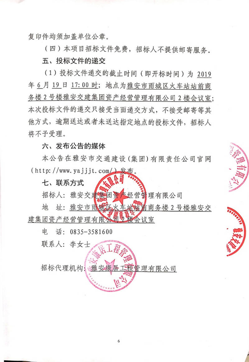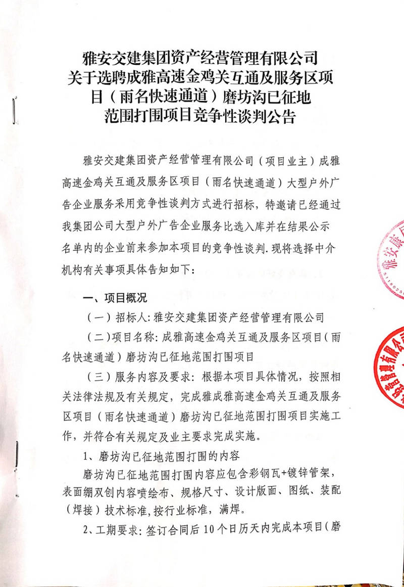 雅安交建集團(tuán)資產(chǎn)經(jīng)營管理有限公司關(guān)于選聘成雅高速金雞關(guān)互通及服務(wù)區(qū)項(xiàng)目(雨名快速通道)磨坊溝已征地范圍打圍項(xiàng)目競爭性談判公告