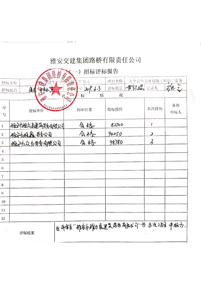 雅安交建集團路橋有限責(zé)任公司天全縣魚泉鄉(xiāng)堤防工程施工勞務(wù)項目邀請招標(biāo)結(jié)果公示