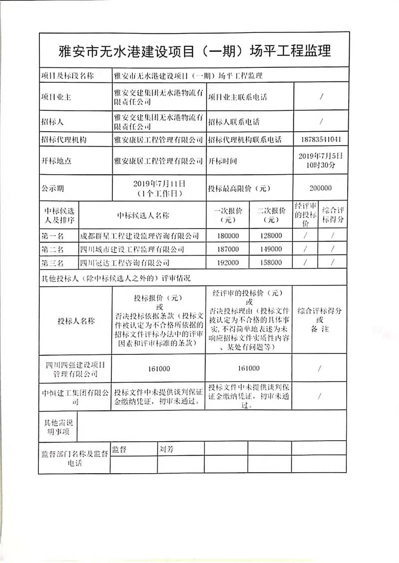 雅安交建集團(tuán)無水港物流有限責(zé)任公司雅安市無水港建設(shè)項目(一期)場平工程監(jiān)理競爭性談判結(jié)果公示