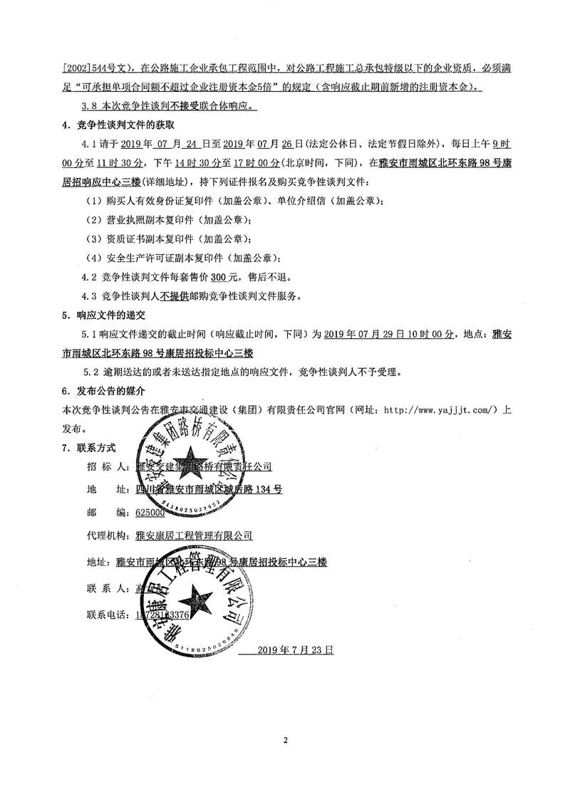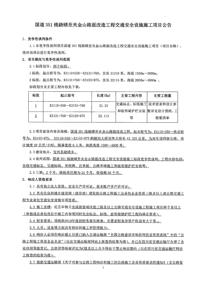 雅安交建集團(tuán)路橋有限責(zé)任公司國道351線磽磧至夾金山段路面改造工程交通安全設(shè)施施工項目競爭性談判公告