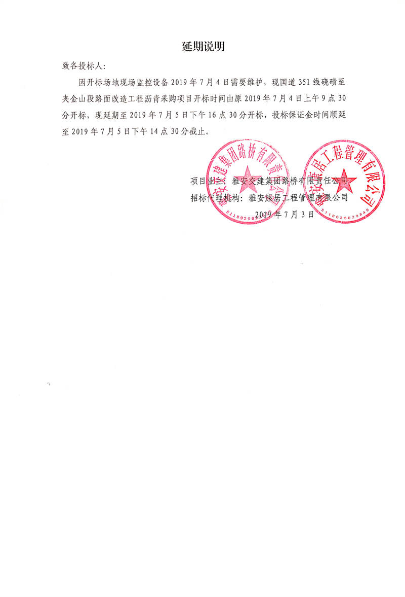 雅安交建集團(tuán)路橋有限責(zé)任公司國(guó)道351線(xiàn)磽磧至夾金山段路面改造工程瀝青采購(gòu)招標(biāo)延期說(shuō)明