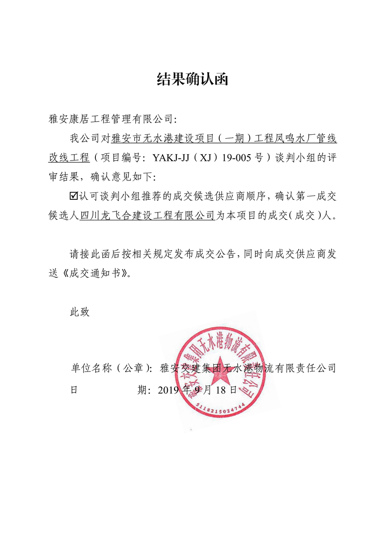 雅安交建集團(tuán)無水港物流有限責(zé)任公司雅安市無水港建設(shè)項(xiàng)目(一期)工程鳳鳴水廠管線改線工程競(jìng)爭性談判結(jié)果公示