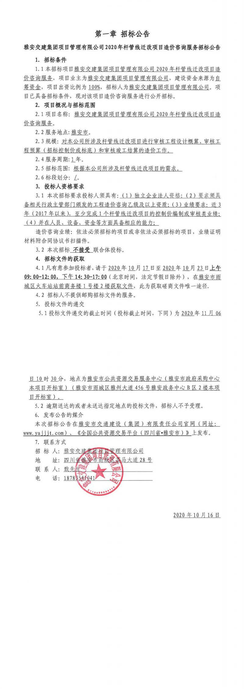 雅安交建集團(tuán)項目管理有限公司2020年桿管線遷改項目造價咨詢服務(wù)招標(biāo)公告
