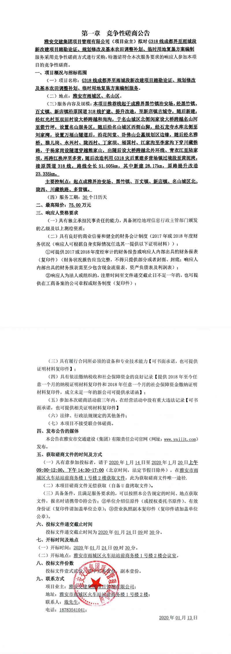 雅安交建集團項目管理有限公司G318線成都界至雨城段新改建項目踏勘論證、規(guī)劃修改及基本農(nóng)田調(diào)整補劃、臨地用地復墾方案編制服務競爭性磋商公告