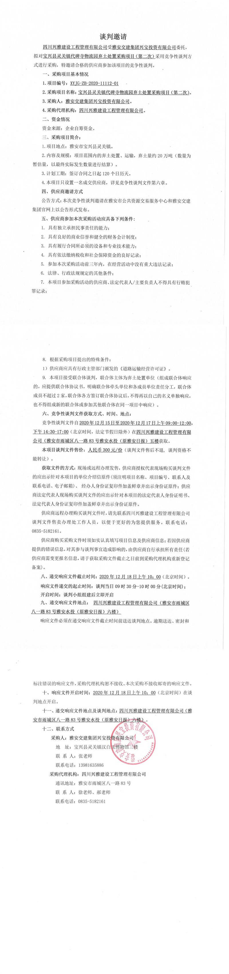 雅安交建集團興寶投資有限公司寶興縣靈關(guān)鎮(zhèn)代碑寺物流園棄土處置采購項目(第二次)談判公告