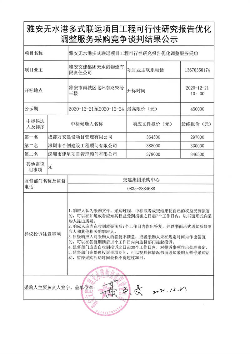 雅安交建集團無水港物流有限責(zé)任公司雅安無水港多式聯(lián)運項目工程可行性研究報告優(yōu)化調(diào)整服務(wù)采購競爭談判結(jié)果公示