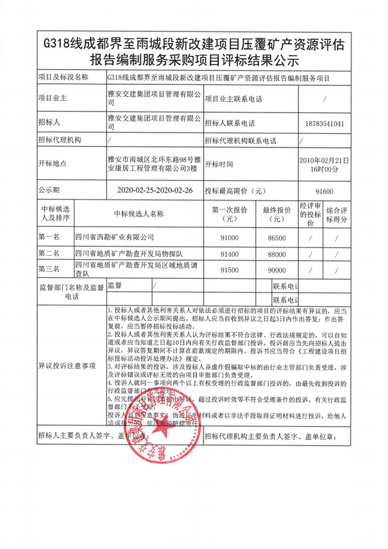 雅安交建集團(tuán)項(xiàng)目管理有限公司G318線成都界至雨城段新改建項(xiàng)目壓覆礦產(chǎn)資源評(píng)估報(bào)告編制服務(wù)采購項(xiàng)目評(píng)標(biāo)結(jié)果公示