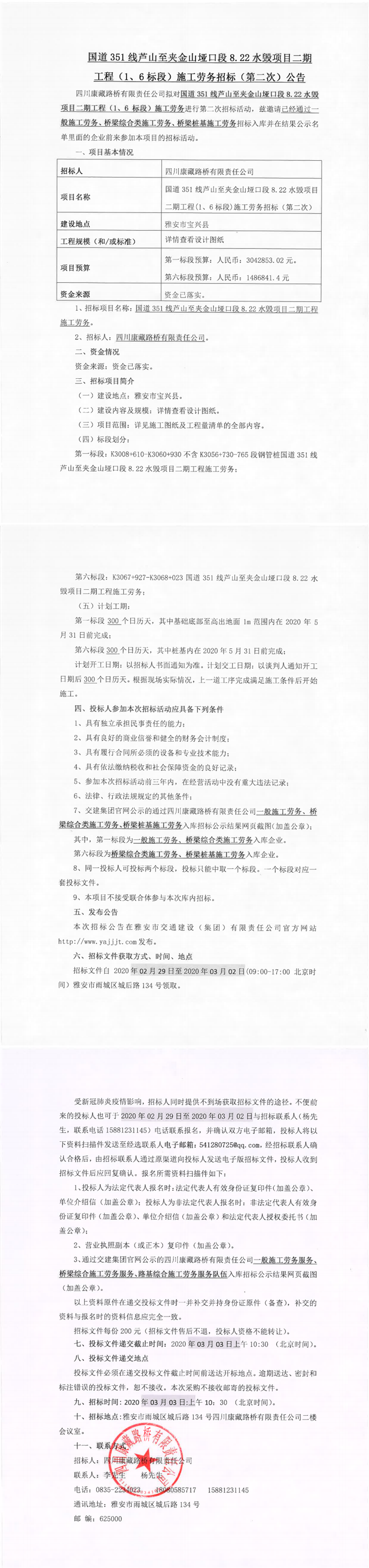 四川康藏路橋有限責(zé)任公司國道351線蘆山至夾金山埡口8.22水毀項目二期工程(1、6標(biāo)段)施工勞務(wù)招標(biāo)(第二次)公告