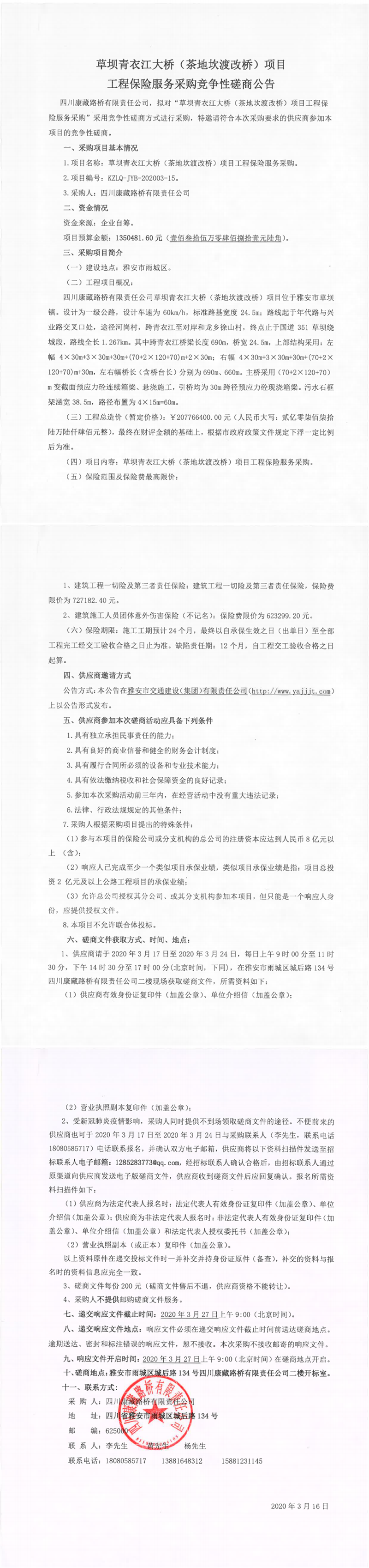 四川康藏路橋有限責(zé)任公司草壩青衣江大橋(茶地坎渡改橋)項(xiàng)目工程保險(xiǎn)服務(wù)采購競爭性磋商公告