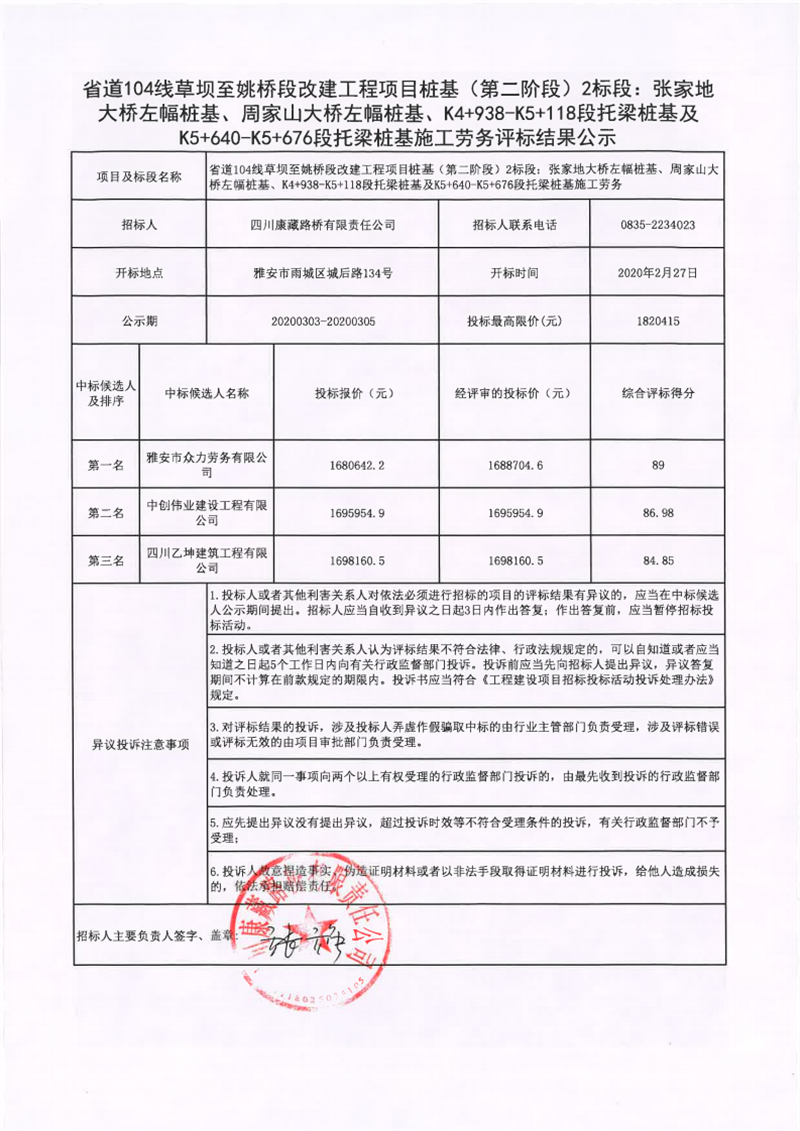 四川康藏路橋有限責(zé)任公司省道104線草壩至姚橋段改建工程項目樁基(第二階段)2標段:張家地大橋左幅樁基、周家山大橋左幅樁基、K4+938-K5+118段托梁樁基及K5+640-K5+676段托梁樁基施工勞務(wù)評標結(jié)果公示