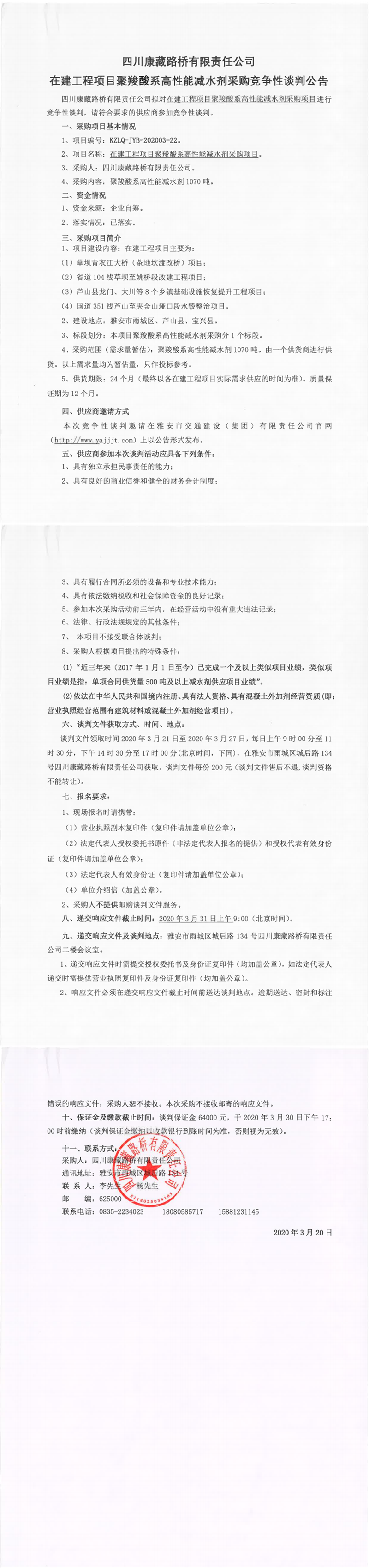 四川康藏路橋有限責(zé)任公司在建工程項(xiàng)目聚羧酸系高性能減水劑采購(gòu)競(jìng)爭(zhēng)性談判公告