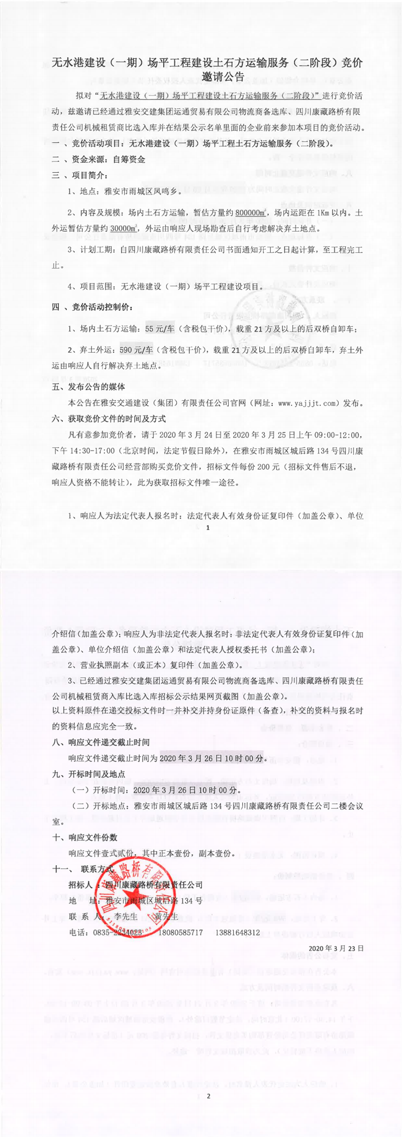 四川康藏路橋有限責(zé)任公司無水港建設(shè)(一期)場平工程建設(shè)土石方運(yùn)輸服務(wù)(二階段)競價(jià)邀請公告