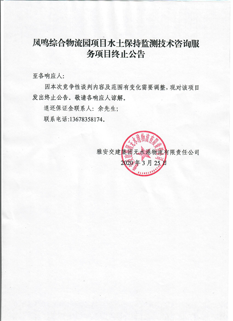 雅安交建集團無水港物流有限責任公司鳳鳴綜合物流園項目水土保持監(jiān)測技術咨詢服務項目終止公告