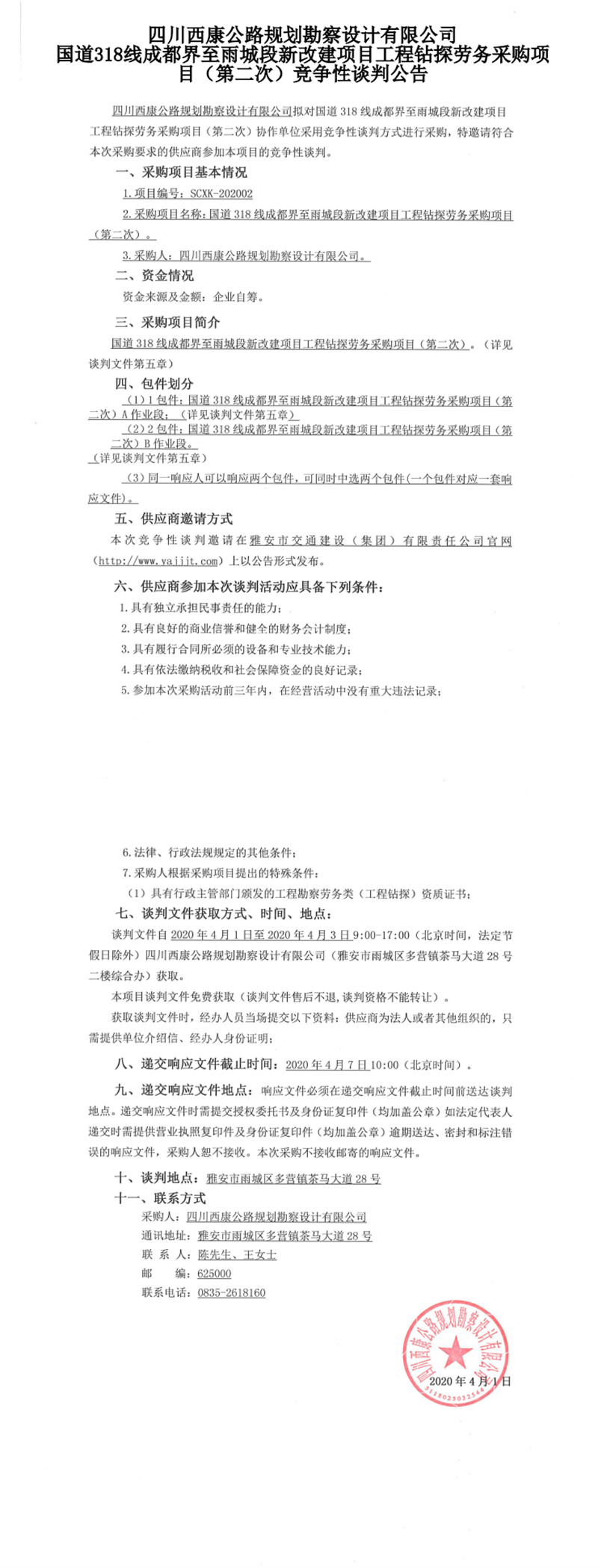 四川西康公路規(guī)劃勘察設(shè)計(jì)有限公司國(guó)道318線(xiàn)成都界至雨城段新改建項(xiàng)目工程鉆探勞務(wù)采購(gòu)項(xiàng)目(第二次)競(jìng)爭(zhēng)性談判公告