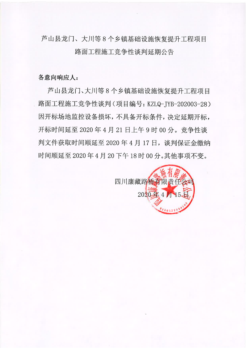 四川康藏路橋有限責(zé)任公司蘆山縣龍門、大川等8個(gè)鄉(xiāng)鎮(zhèn)基礎(chǔ)設(shè)施恢復(fù)提升工程項(xiàng)目路面工程施工競(jìng)爭(zhēng)性談判延期公告