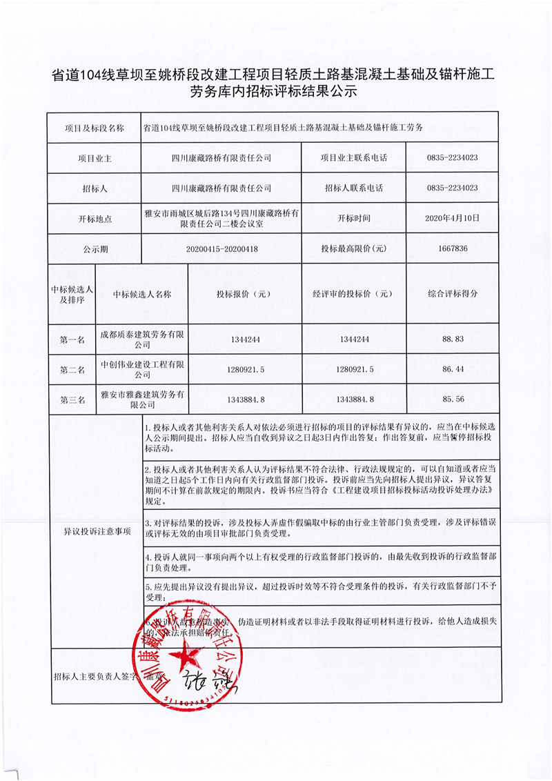 四川康藏路橋有限責任公司省道104線草壩至姚橋段改建工程項目輕質(zhì)土路基混凝土基礎及錨桿施工勞務庫內(nèi)招標評標結果公示