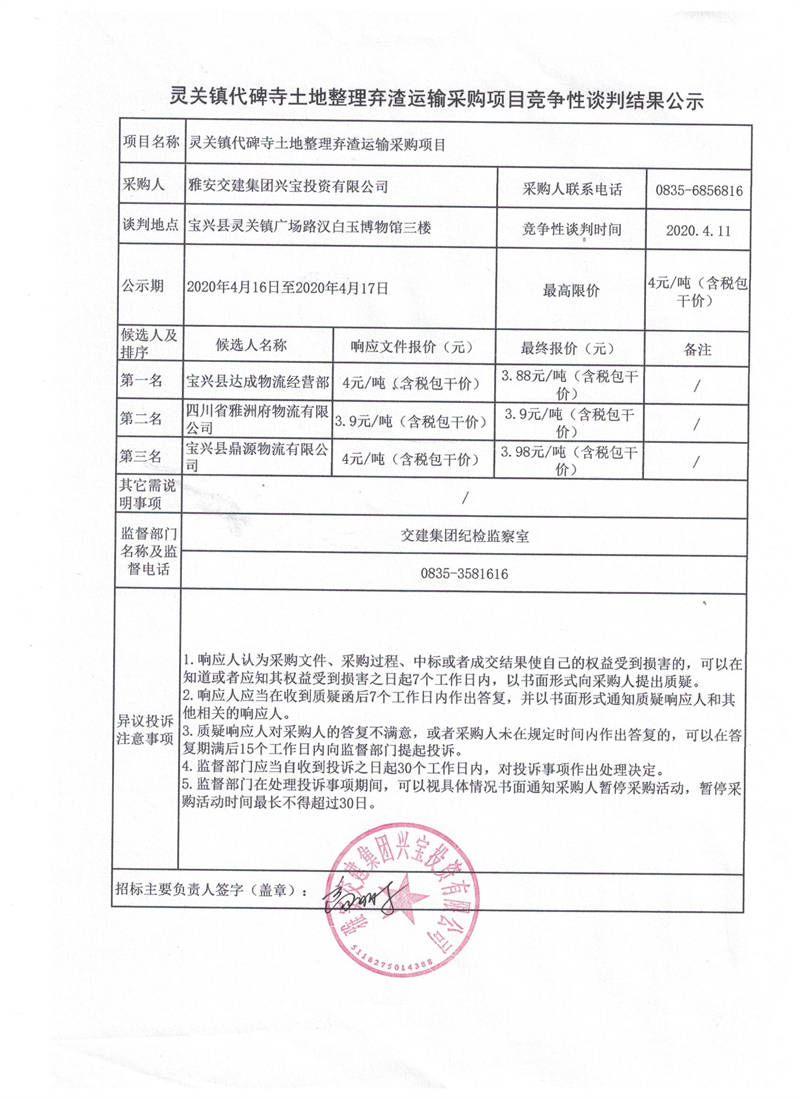 雅安交建集團(tuán)興寶投資有限公司靈關(guān)鎮(zhèn)代碑寺土地整理?xiàng)壴\(yùn)輸采購項(xiàng)目競爭性談判結(jié)果公示