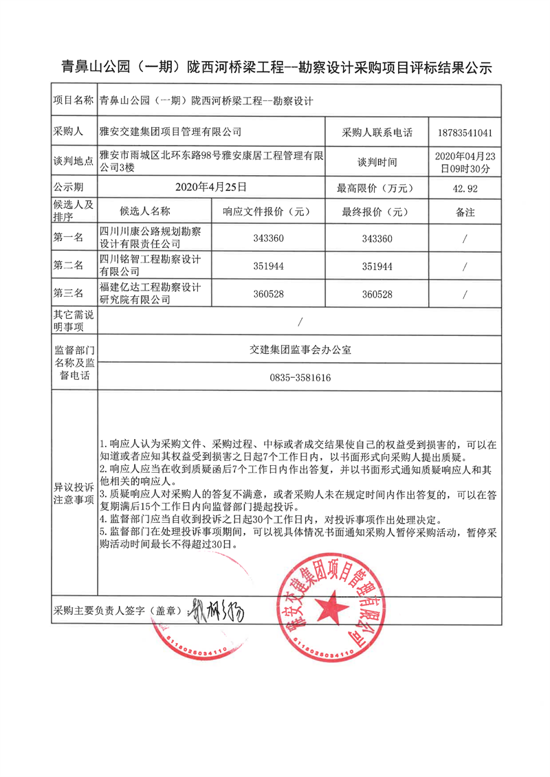 雅安交建集團項目管理有限公司青鼻山公園(一期)隴西河橋梁工程項目勘察設(shè)計采購項目評標(biāo)結(jié)果公示