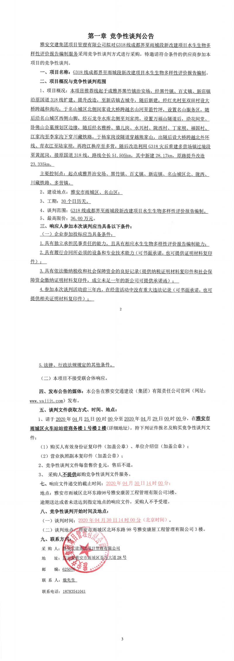 雅安交建集團(tuán)項(xiàng)目管理有限公司G318線成都界至雨城段新改建項(xiàng)目水生生物多樣性影響評價(jià)編制競爭性談判公告