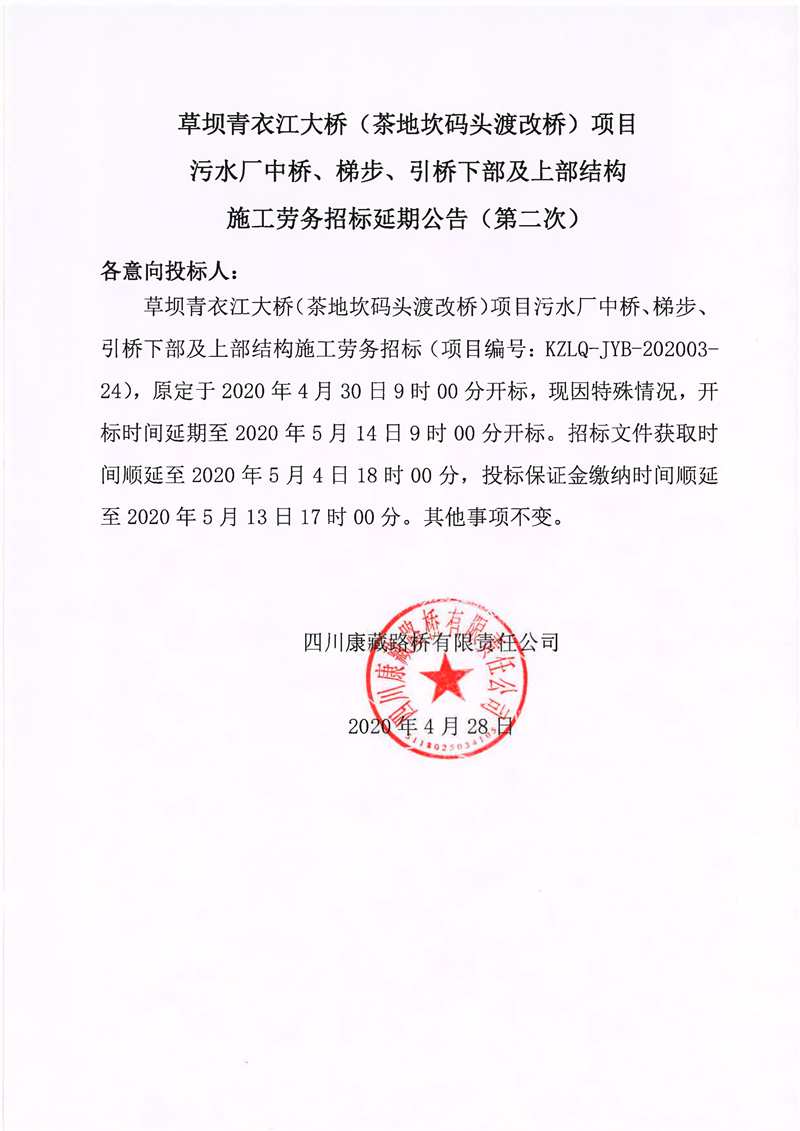 四川康藏路橋有限責任公司草壩青衣江大橋(茶地坎碼頭渡改橋)項目污水廠中橋、梯步、引橋下部及上部結構施工勞務招標延期公告(第二次)