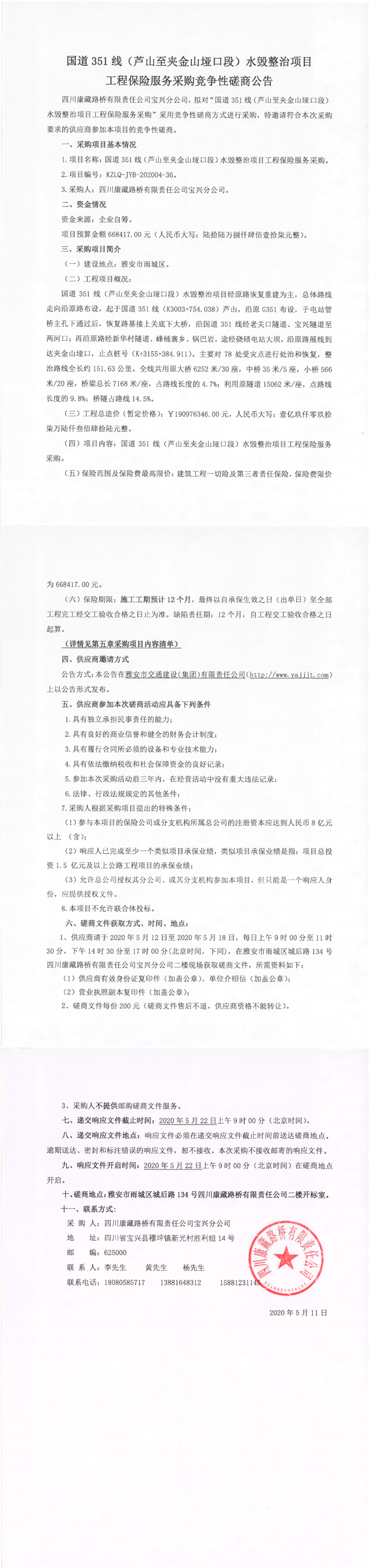 四川康藏路橋有限責(zé)任公司寶興分公司國道351線(蘆山至夾金山埡口段)水毀整治項(xiàng)目工程保險(xiǎn)服務(wù)采購競爭性磋商公告