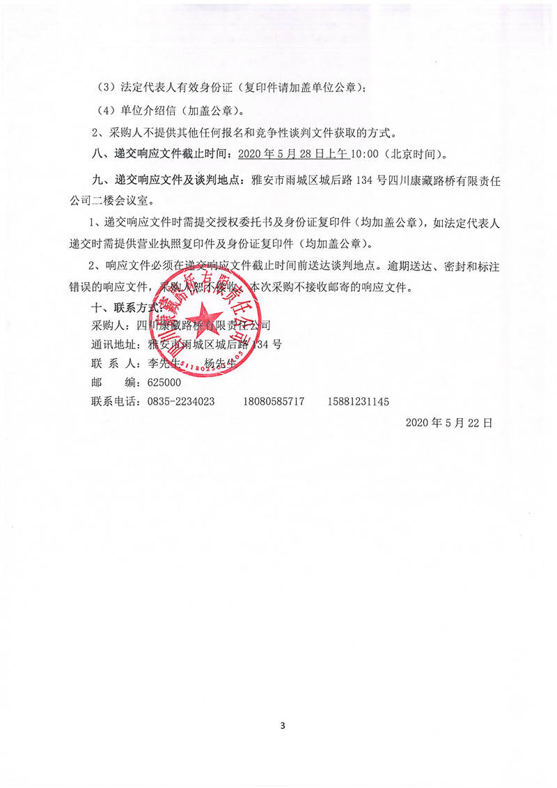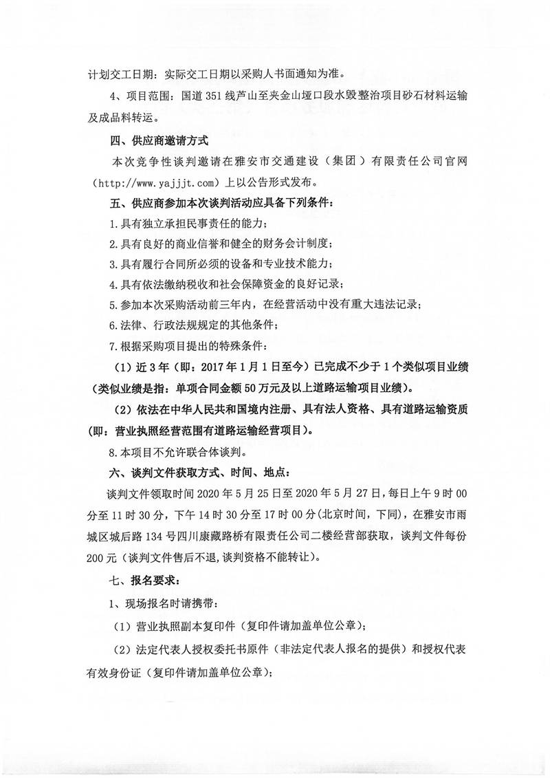 四川康藏路橋有限責(zé)任公司國(guó)道351線蘆山至夾金山埡口段8.22水毀項(xiàng)目砂石材料運(yùn)輸服務(wù)項(xiàng)目(第三次)談判公告