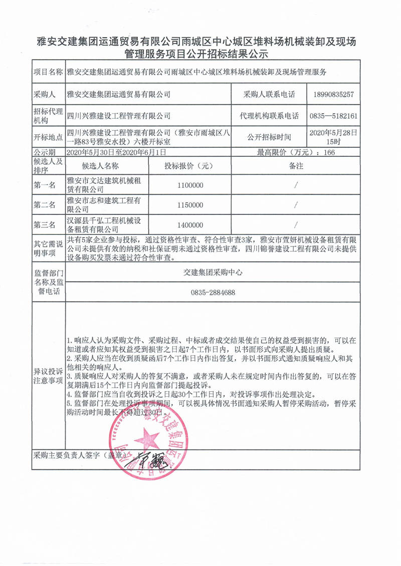 雅安交建集團運通貿易有限公司雨城區(qū)中心城區(qū)堆料場機械裝卸及現場管理服務項目公開招標結果公示
