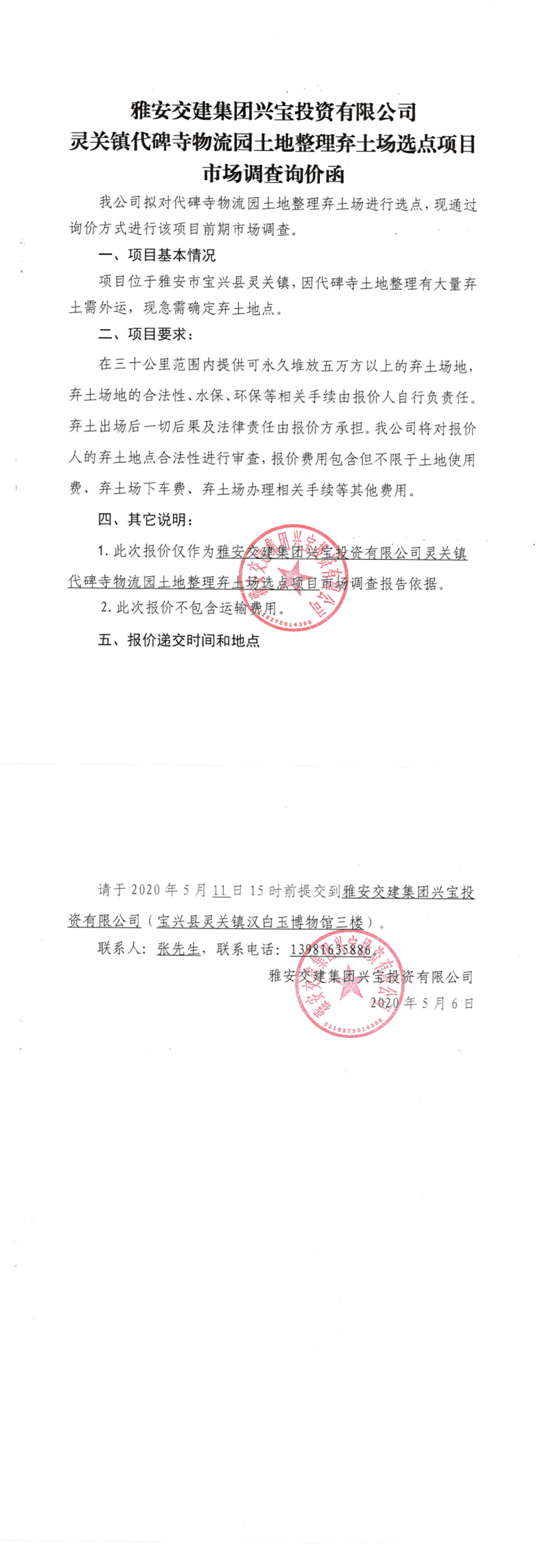 雅安交建集團(tuán)興寶投資有限公司靈關(guān)鎮(zhèn)代碑寺物流園土地整理?xiàng)壨翀鲞x點(diǎn)項(xiàng)目市場調(diào)查詢價函