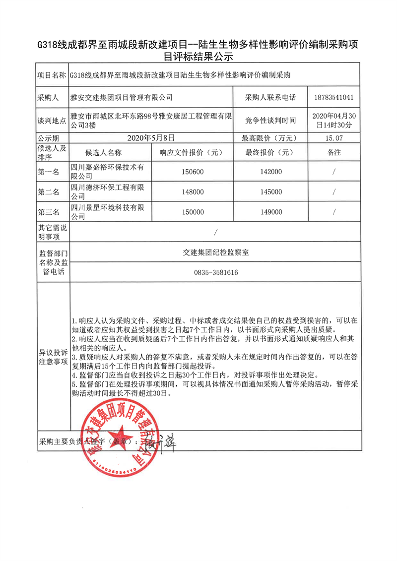 雅安交建集團項目管理有限公司G318線成都界至雨城段新改建項目陸生生物多樣性影響評價編制采購項目評標(biāo)結(jié)果公示
